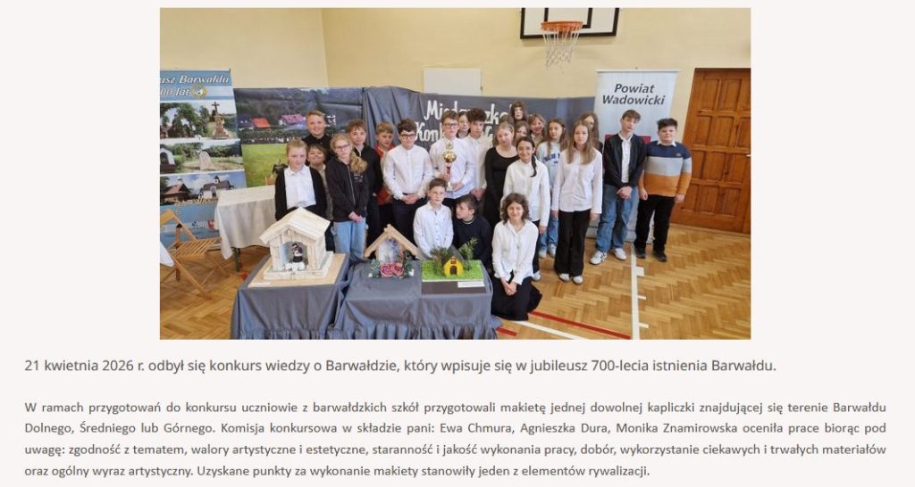 1326 - 2026 700 lat Barwałdu Patronat honorowy "Gdzie prochy naszych przodków i ziemia zroszona ich potem - tam nasza Ojczyzna." - Gustaw Studnicki Za nami 14 czerwca 2025 r.Trzecia część obchodów Jubileuszu - Barwałd Dolny Czytaj więcej Podziękowania od organizatorów Sprawozdanie Stowarzyszenia „JUBILEUSZ BARWAŁDU’’z działalności Stowarzyszenia za 2024 rok zaprezentowane nazebraniu walnym w dniu 12 lutego 2025 r.w Barwałdzie Średnim.Zobacz szczegóły 15 czerwca 2024 r.Druga część obchodów Jubileuszu - Barwałd Górny Czytaj więcej Podziękowania od organizatorów 17 czerwca 2023 r.Pierwsza część obchodów Jubileuszu - Barwałd Średni Czytaj więcej Podziękowania od organizatorów Poznaj Barwałd Barwałd Dolny, Barwałd Średni i Barwałd Górny to wioski położone na pograniczu Pogórza Wielickiego i Beskidu Makowskiego. Czytaj więcej Plan obchodów jubileuszu 700-lecia Barwałdu W ramach obchodów planujemy czytaj więcej